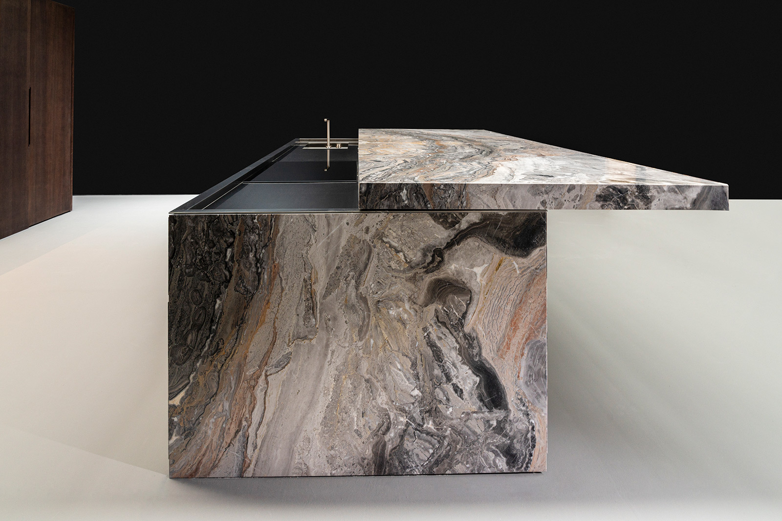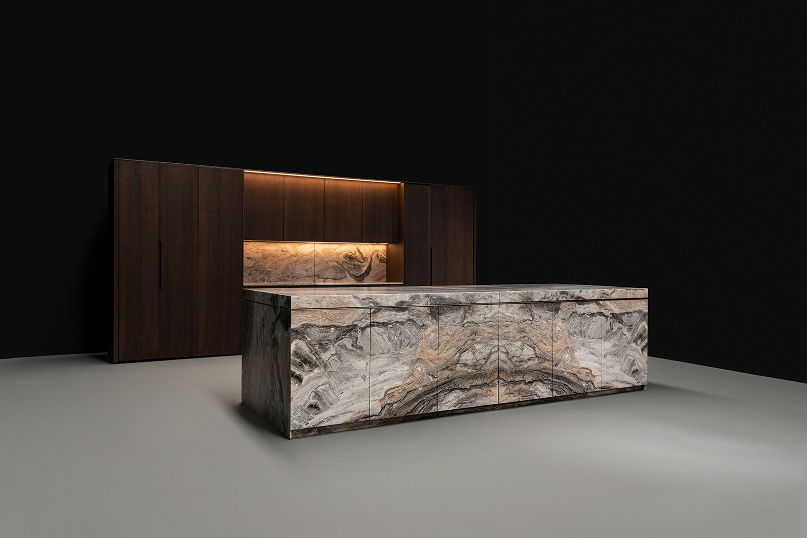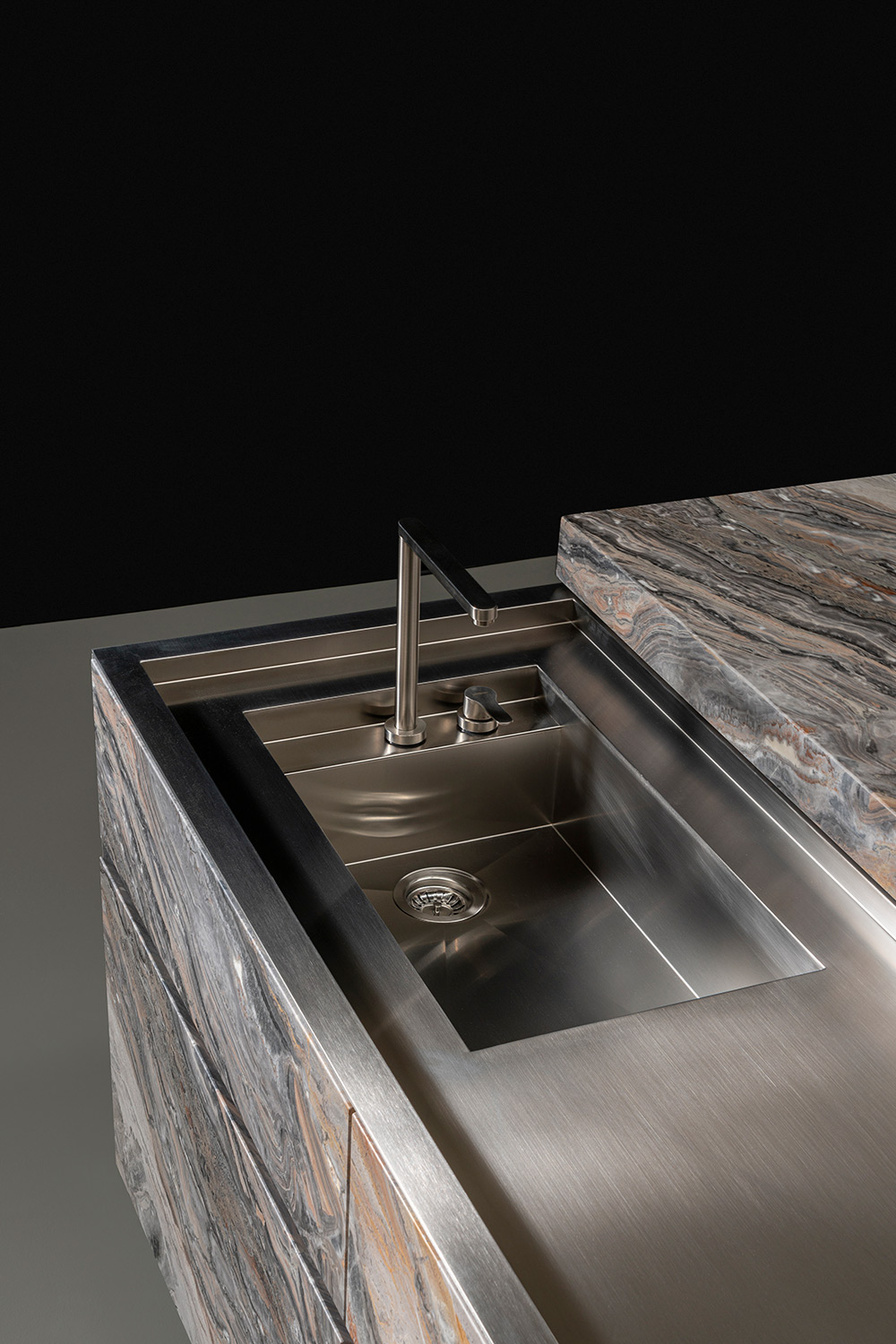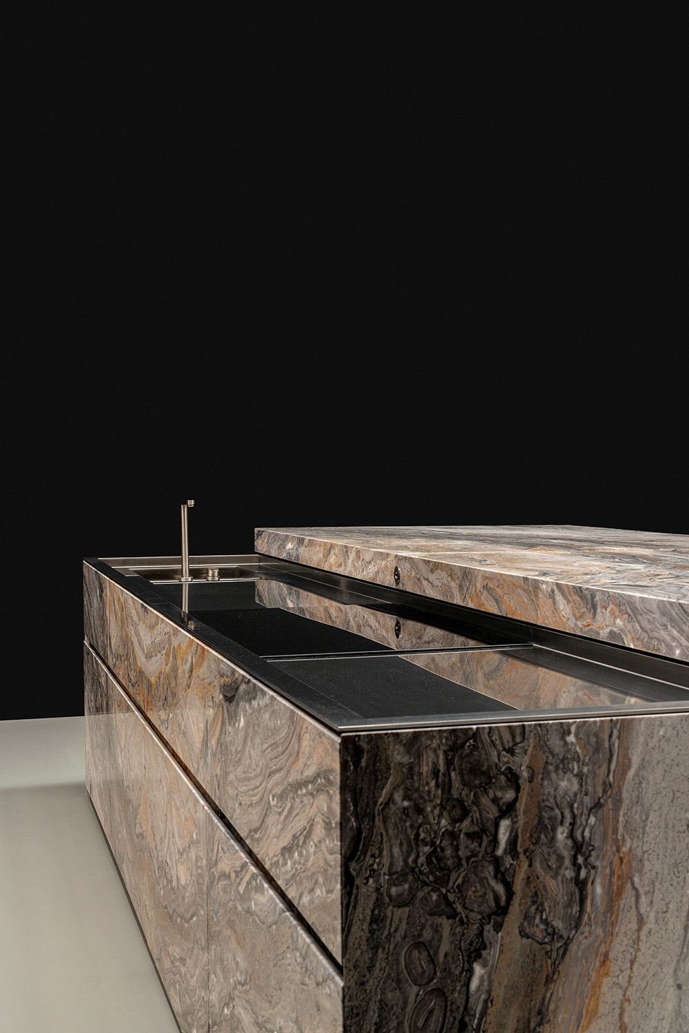 NP4 es la expresión de una cocina contemporánea que une materialidad, elegancia e innovación. Protagonista del espacio, la isla monolítica en Grigio Orobico se impone como una escultura funcional: sólida, compacta, esencial. Las vetas de la piedra natural se entrelazan en un diseño orgánico y poderoso, dialogando con la sofisticación arquitectónica del entorno. A sus espaldas, la columnata en roble Terra oculta dos backsplash motorizados de 180 cm cada uno, integrados con absoluta precisión en el mueble. Con un simple gesto o un comando de voz, las superficies se elevan, revelando nichos iluminados y equipados, pensados para contener y organizar con discreción e inteligencia. NP4 es una cocina sofisticada, pensada para quienes buscan belleza, rendimiento y tecnología invisible. Un equilibrio perfecto entre forma escultórica y funcionalidad avanzada.