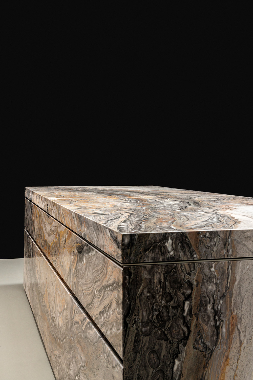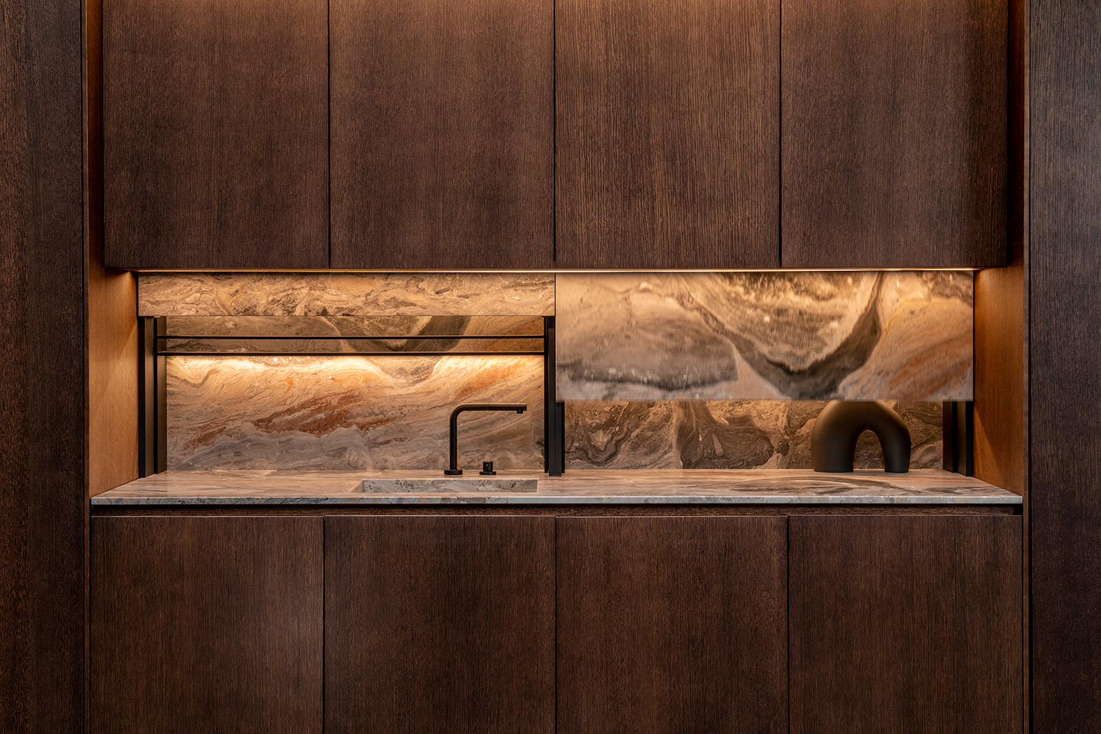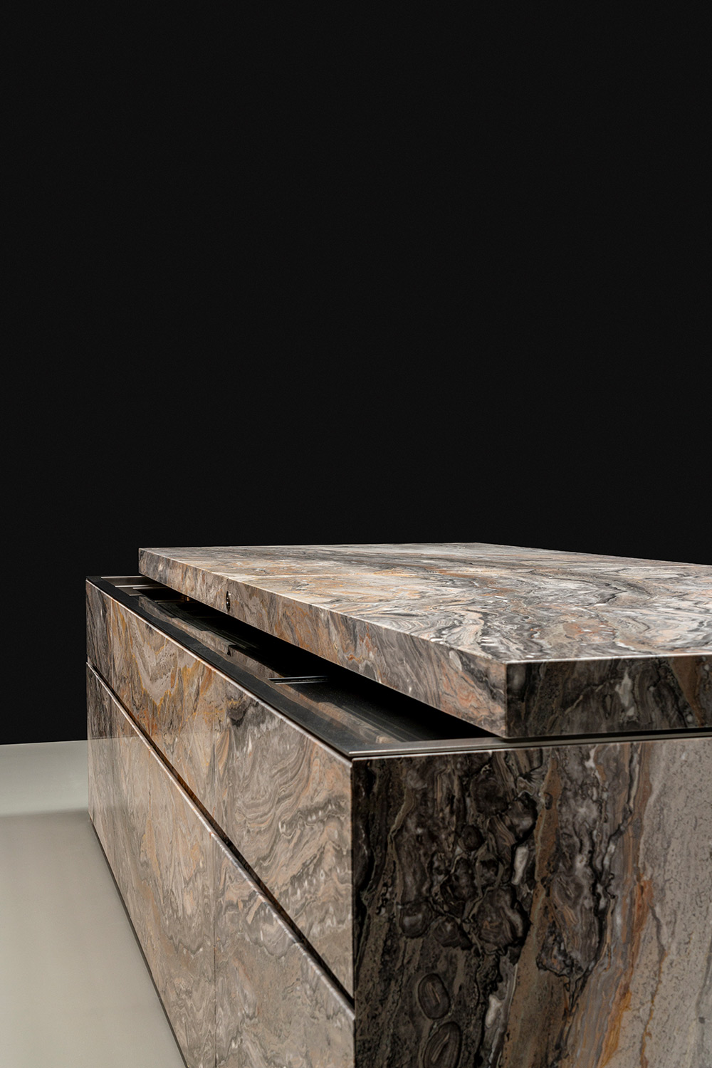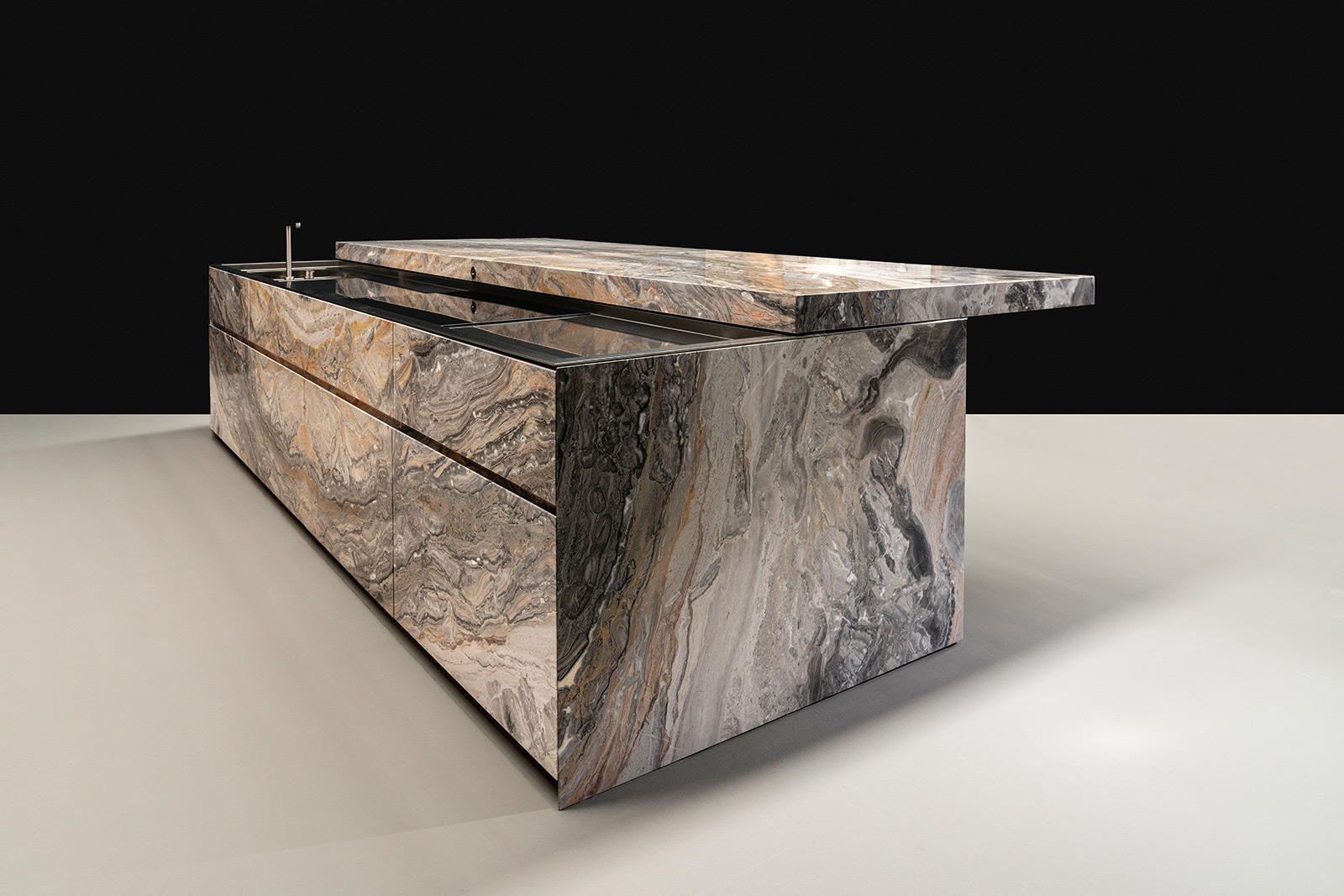 NP4 es la expresión de una cocina contemporánea que une materialidad, elegancia e innovación. Protagonista del espacio, la isla monolítica en Grigio Orobico se impone como una escultura funcional: sólida, compacta, esencial. Las vetas de la piedra natural se entrelazan en un diseño orgánico y poderoso, dialogando con la sofisticación arquitectónica del entorno. A sus espaldas, la columnata en roble Terra oculta dos backsplash motorizados de 180 cm cada uno, integrados con absoluta precisión en el mueble. Con un simple gesto o un comando de voz, las superficies se elevan, revelando nichos iluminados y equipados, pensados para contener y organizar con discreción e inteligencia. NP4 es una cocina sofisticada, pensada para quienes buscan belleza, rendimiento y tecnología invisible. Un equilibrio perfecto entre forma escultórica y funcionalidad avanzada.