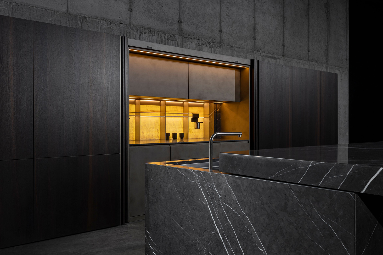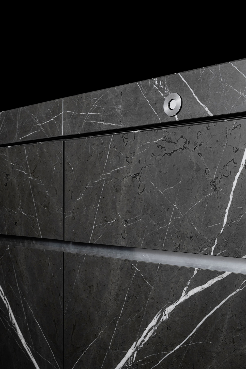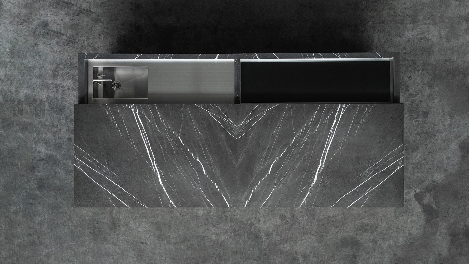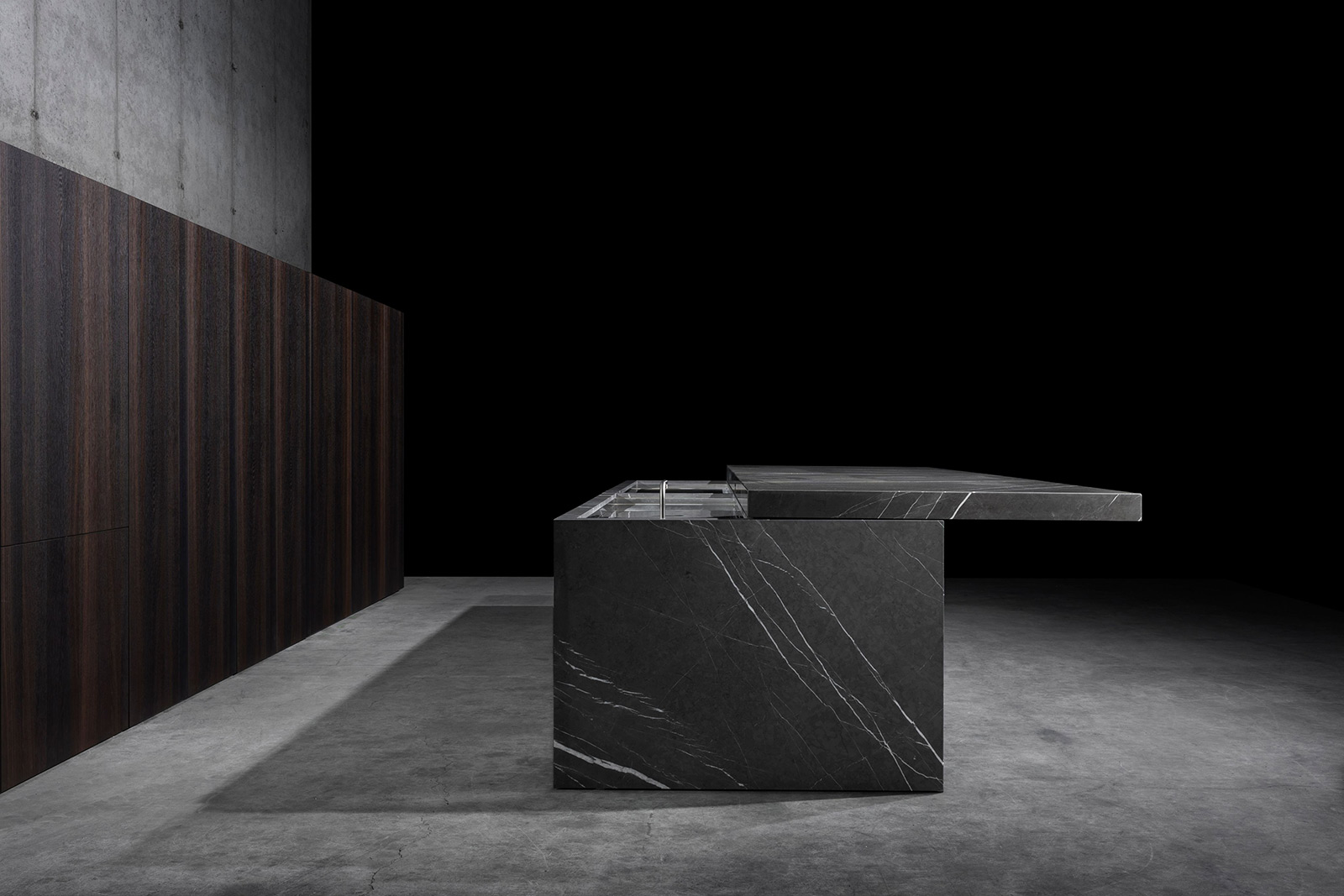 NP4 is characterized by a combination of unique elements that define its contemporary spirit. In this version, the 13-foot (4000 mm) island is made of gray stone rather than Super White marble, offering a more textured and sophisticated look. Retractable doors in thermo-treated oak elegantly conceal the equipment, while the new motorized backsplash reveals a backlit onyx panel with an integrated aluminum storage accessory. The island features the largest sliding marble top ever made, which moves via a safe mechanical control system and locks securely in both open and closed positions. Beneath the precious marble lies a stainless steel worktop with an integrated sink, allowing users to cook freely without the risk of staining the natural stone.