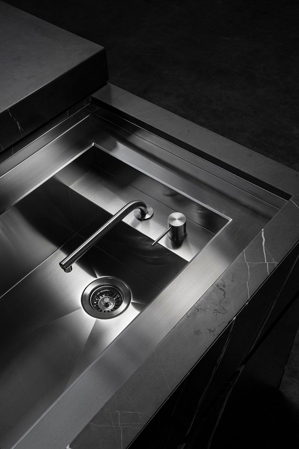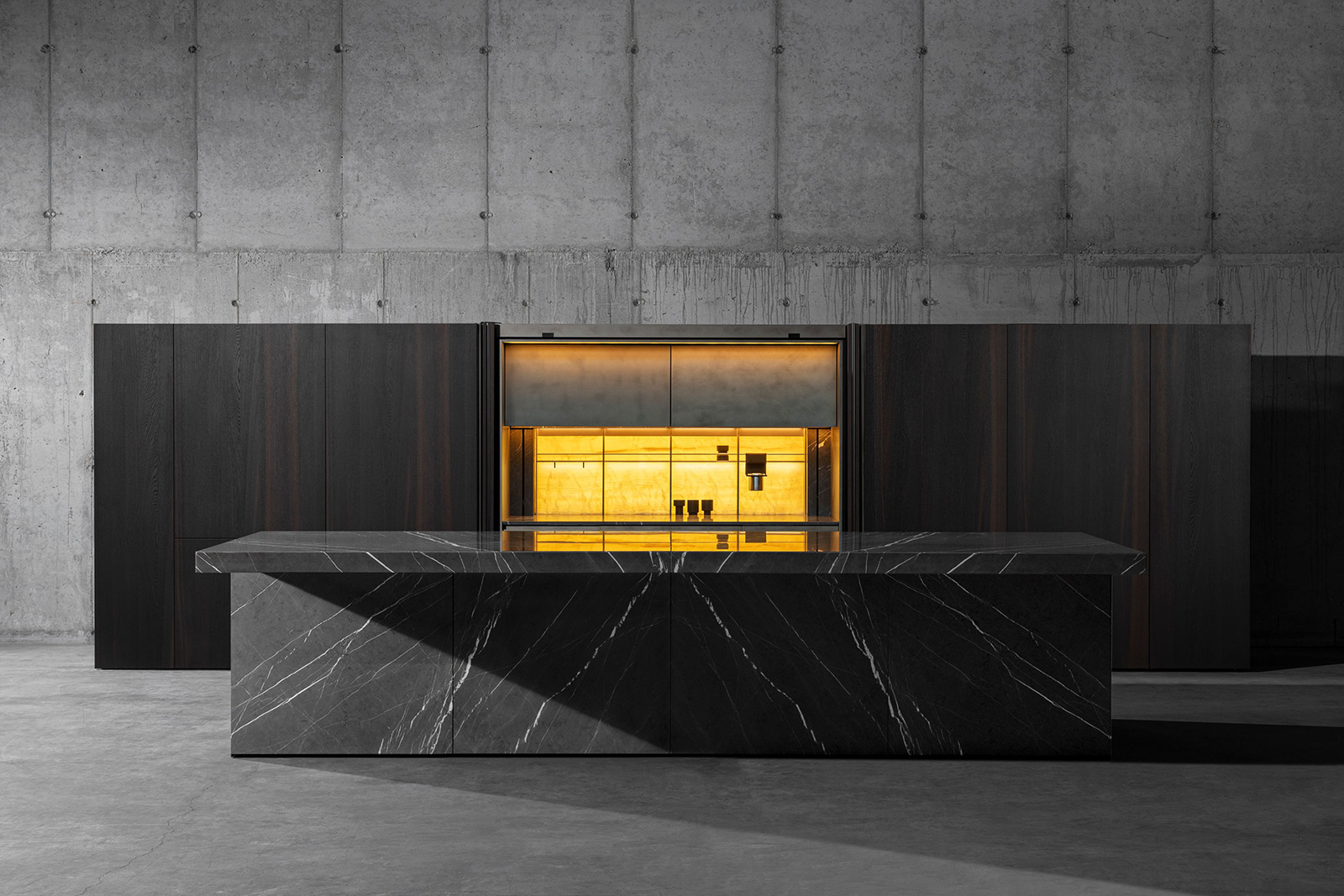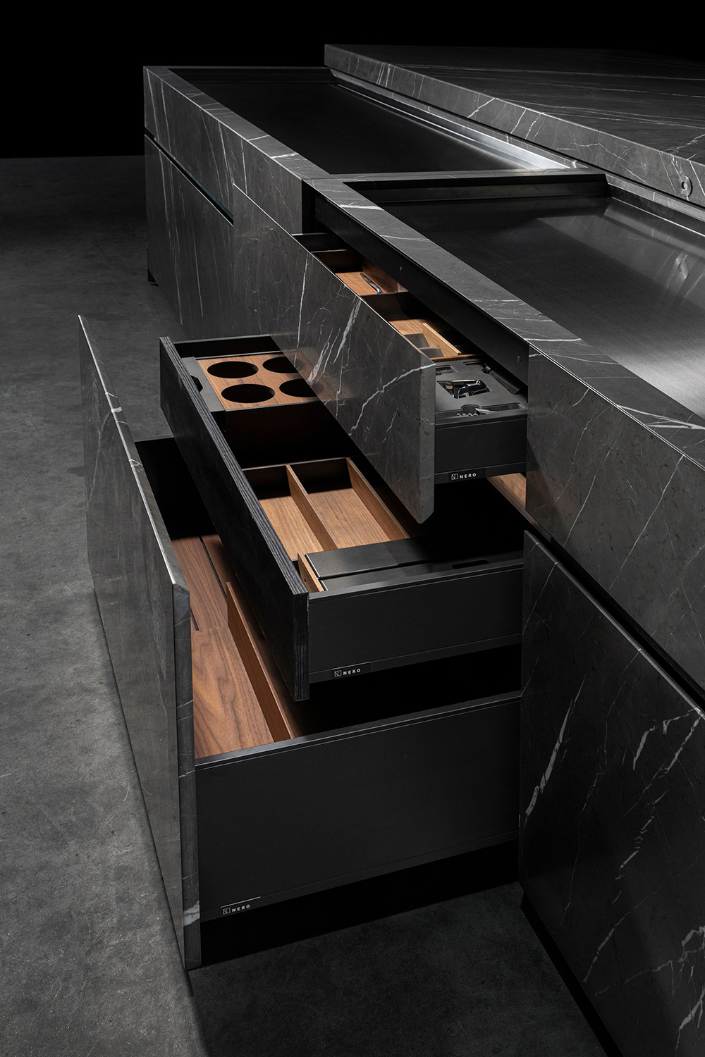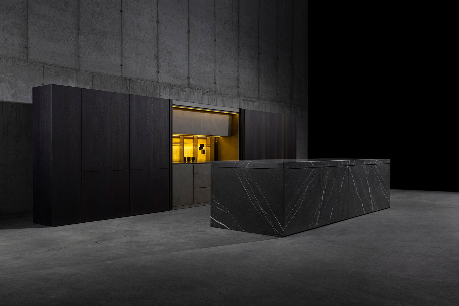 NP4 is characterized by a combination of unique elements that define its contemporary spirit. In this version, the 13-foot (4000 mm) island is made of gray stone rather than Super White marble, offering a more textured and sophisticated look. Retractable doors in thermo-treated oak elegantly conceal the equipment, while the new motorized backsplash reveals a backlit onyx panel with an integrated aluminum storage accessory. The island features the largest sliding marble top ever made, which moves via a safe mechanical control system and locks securely in both open and closed positions. Beneath the precious marble lies a stainless steel worktop with an integrated sink, allowing users to cook freely without the risk of staining the natural stone.