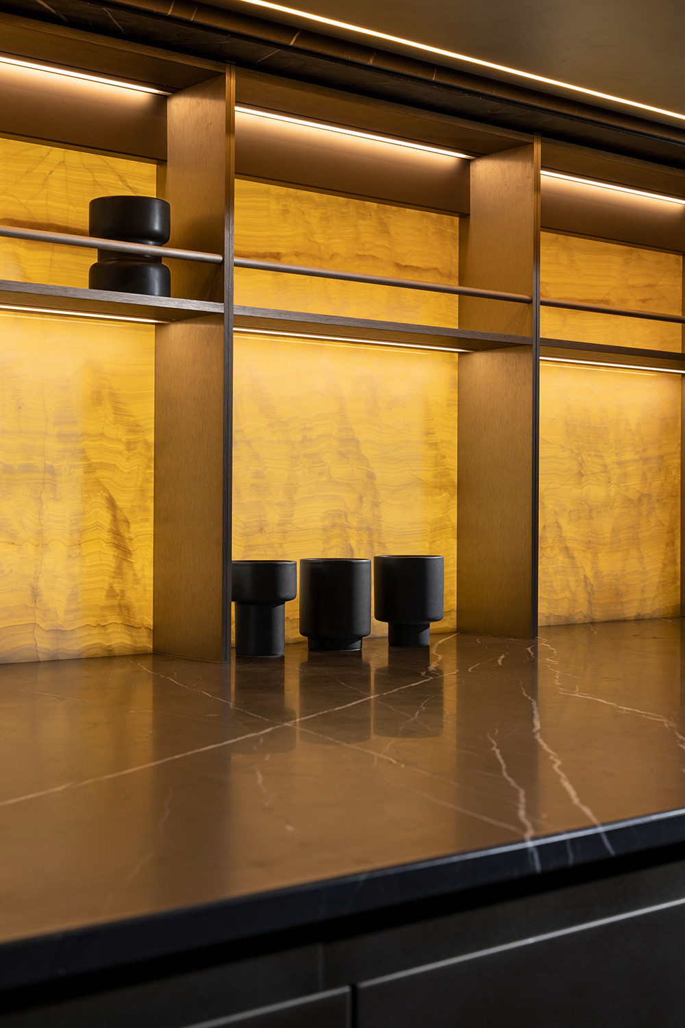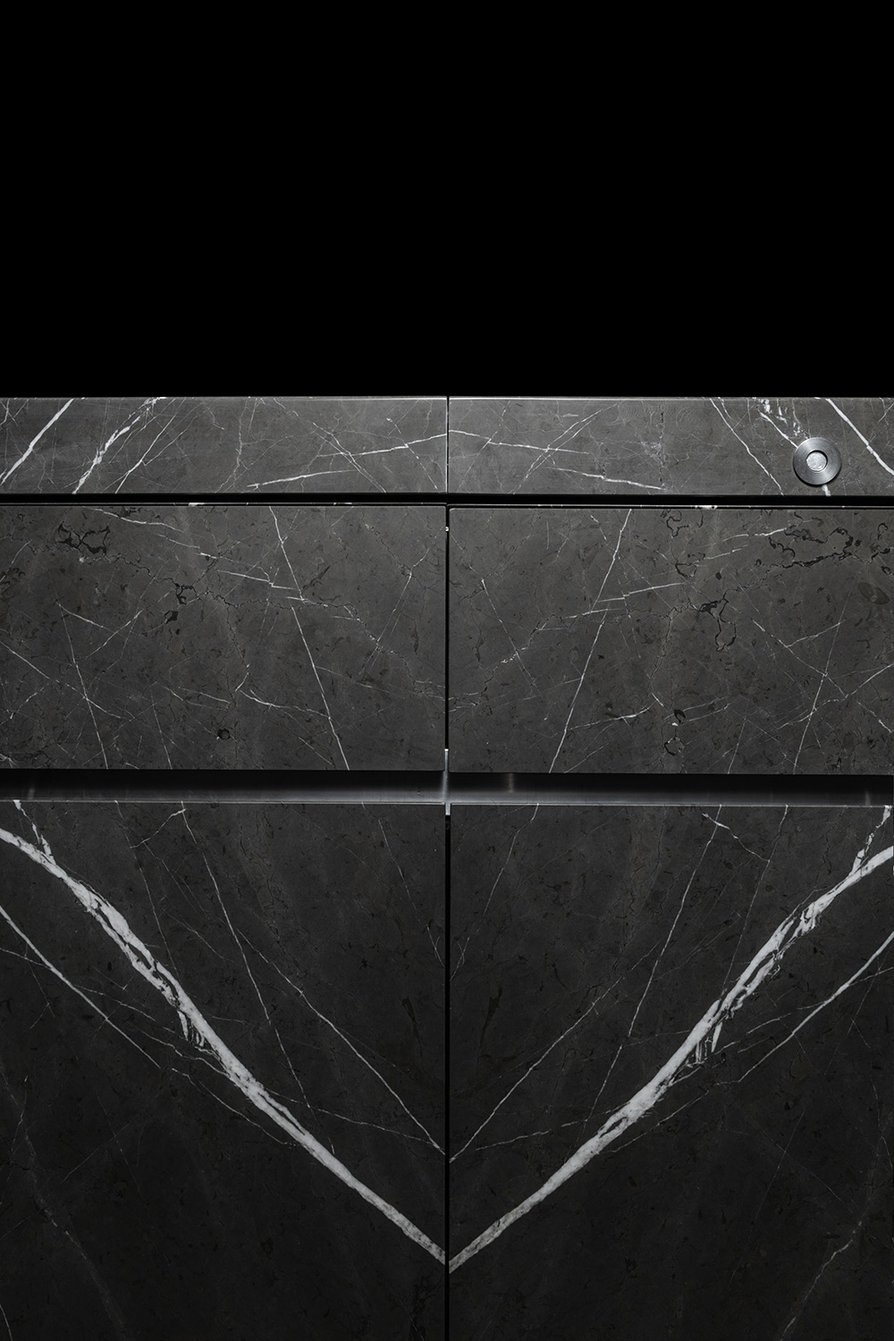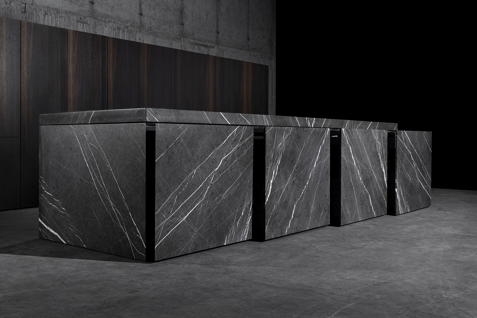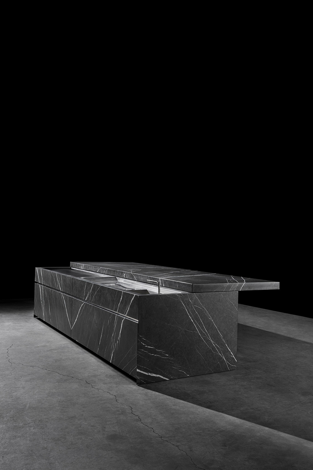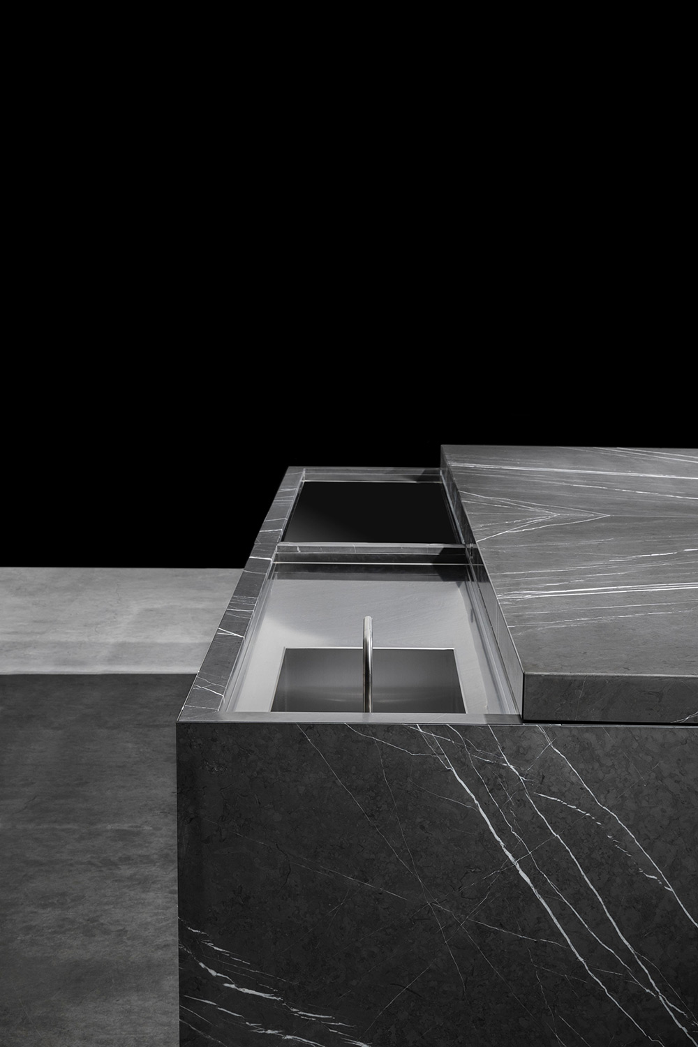 NP4 is characterized by a combination of unique elements that define its contemporary spirit. In this version, the 13-foot (4000 mm) island is made of gray stone rather than Super White marble, offering a more textured and sophisticated look. Retractable doors in thermo-treated oak elegantly conceal the equipment, while the new motorized backsplash reveals a backlit onyx panel with an integrated aluminum storage accessory. The island features the largest sliding marble top ever made, which moves via a safe mechanical control system and locks securely in both open and closed positions. Beneath the precious marble lies a stainless steel worktop with an integrated sink, allowing users to cook freely without the risk of staining the natural stone.