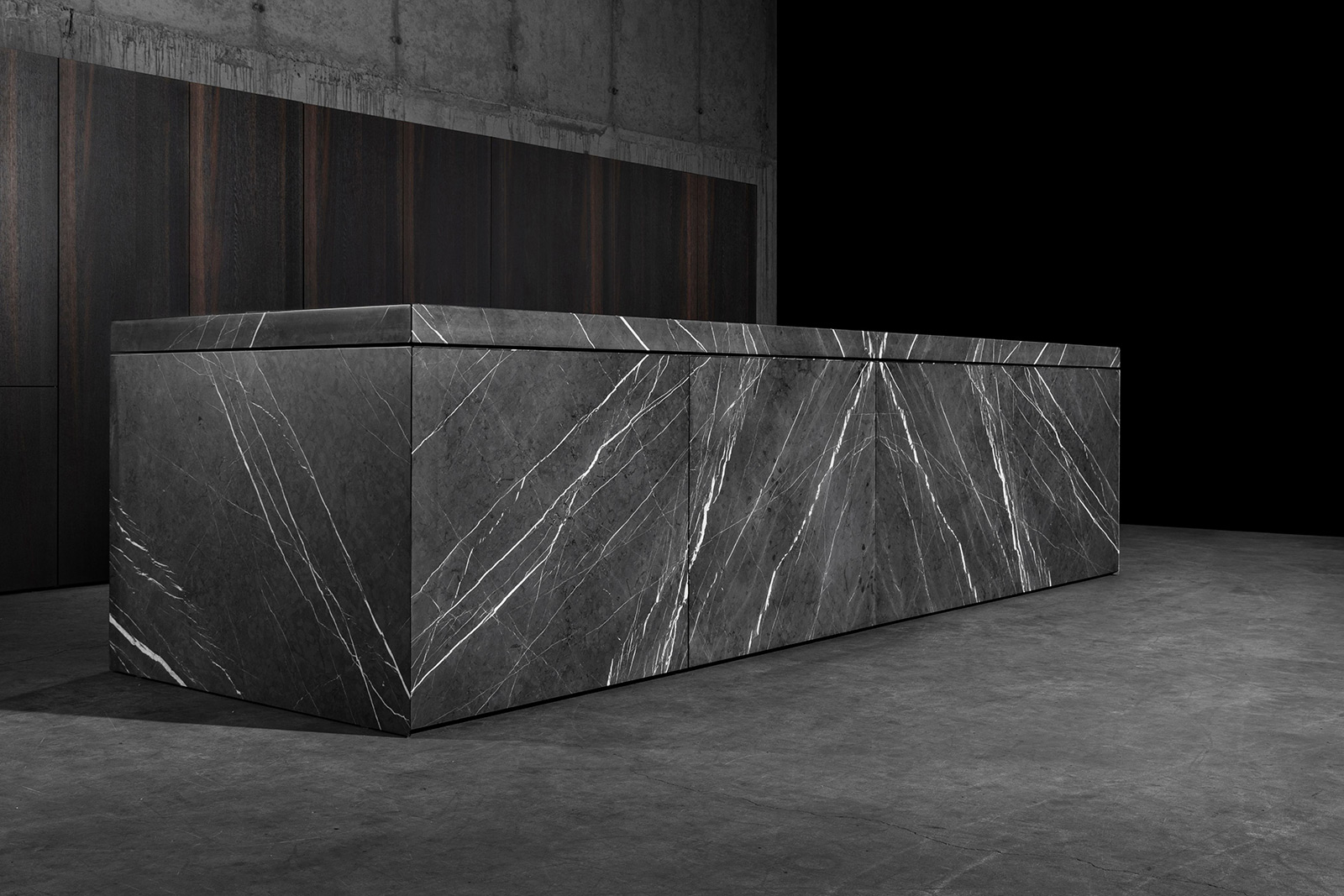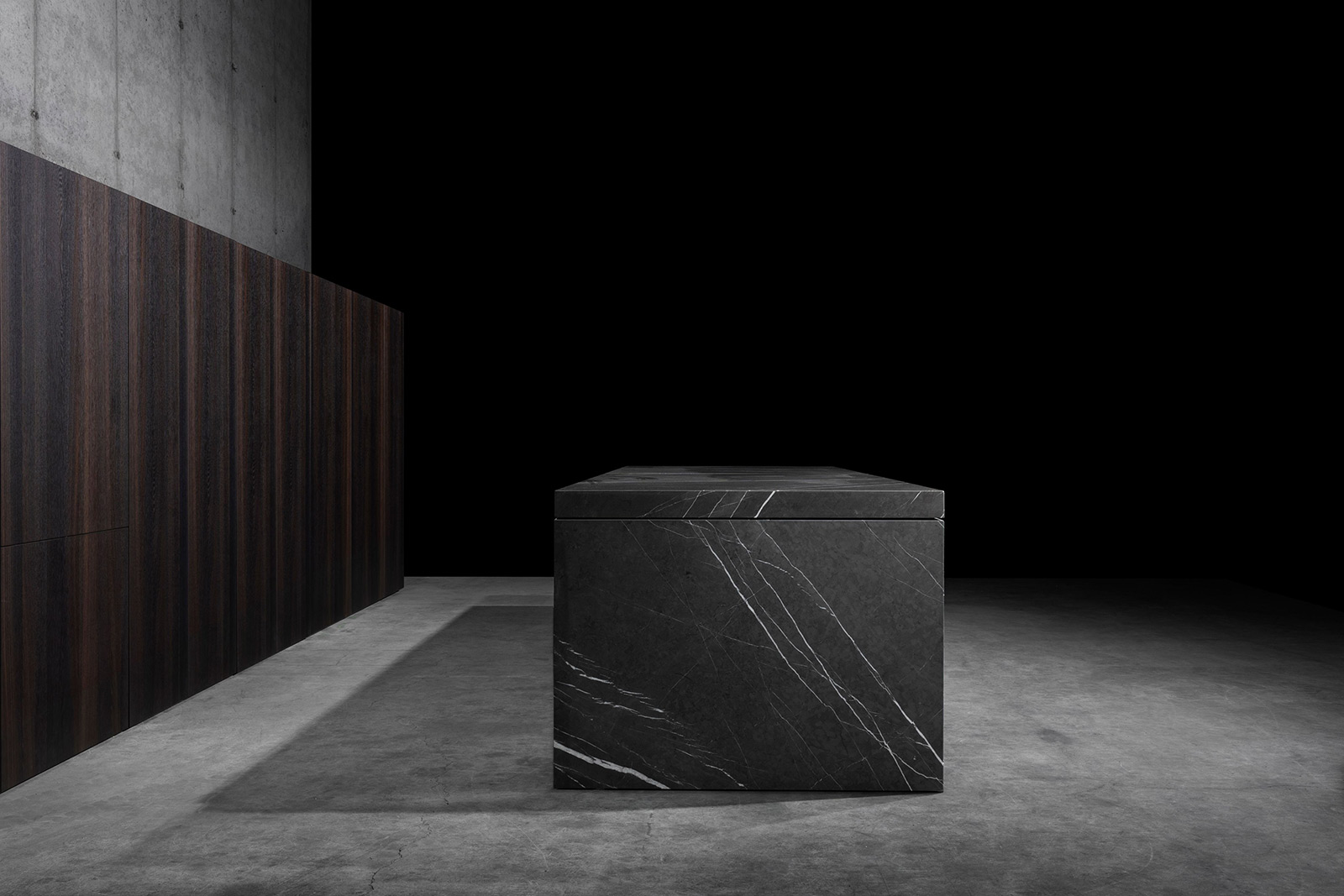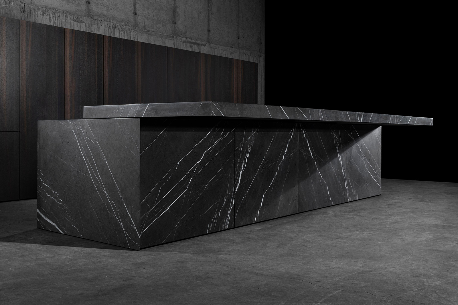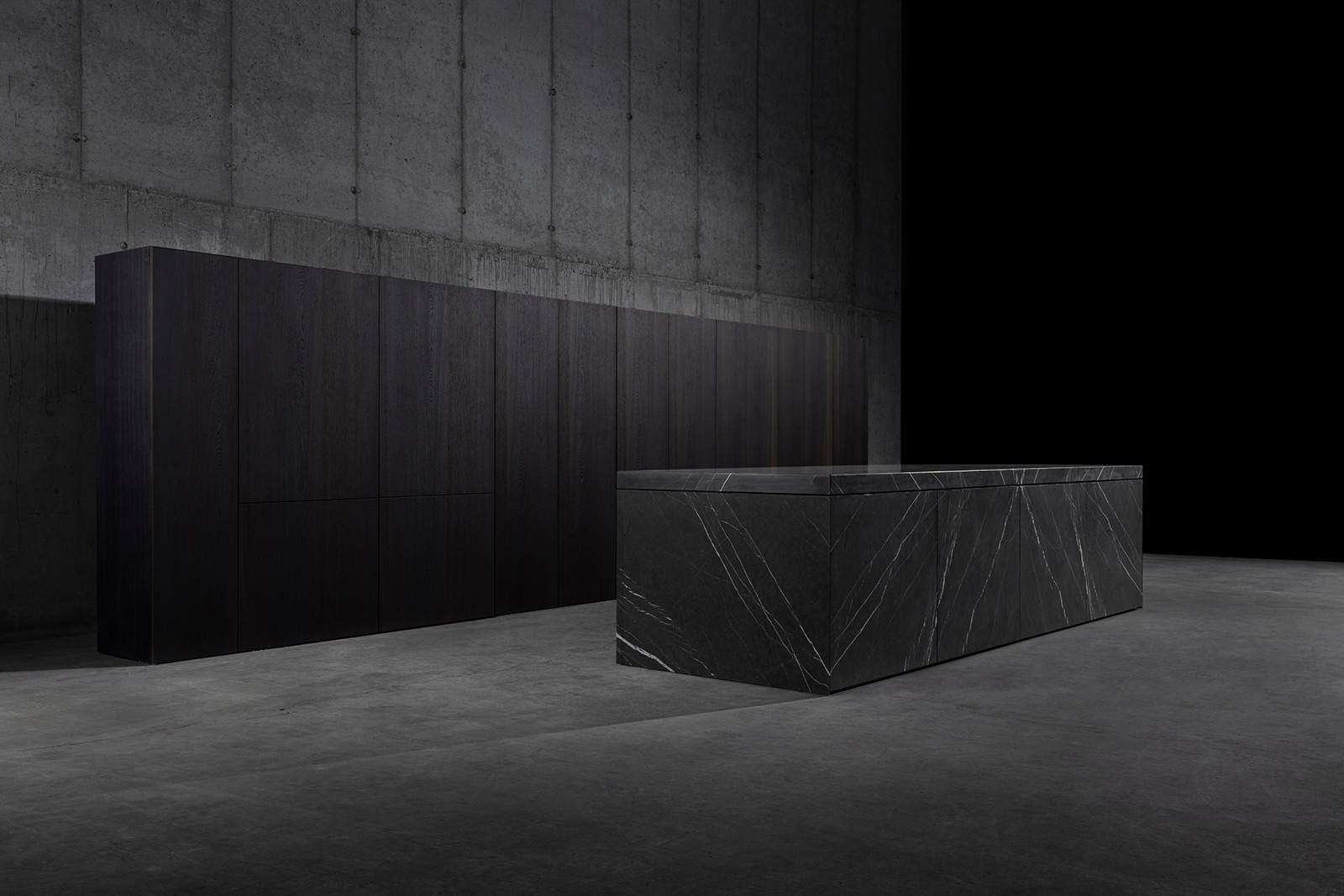 NP4 is characterized by a combination of unique elements that define its contemporary spirit. In this version, the 13-foot (4000 mm) island is made of gray stone rather than Super White marble, offering a more textured and sophisticated look. Retractable doors in thermo-treated oak elegantly conceal the equipment, while the new motorized backsplash reveals a backlit onyx panel with an integrated aluminum storage accessory. The island features the largest sliding marble top ever made, which moves via a safe mechanical control system and locks securely in both open and closed positions. Beneath the precious marble lies a stainless steel worktop with an integrated sink, allowing users to cook freely without the risk of staining the natural stone.