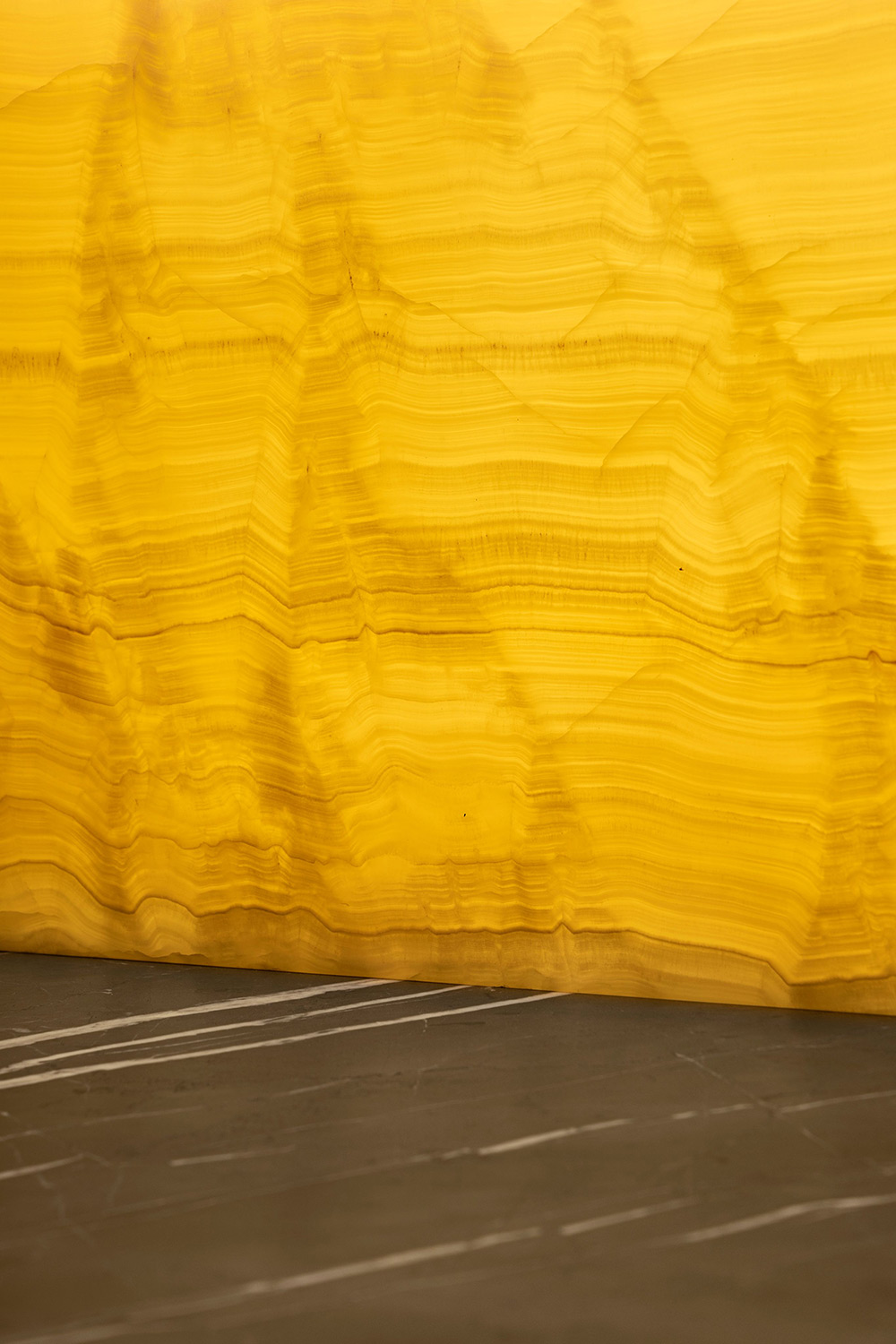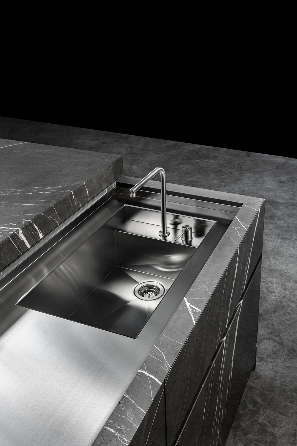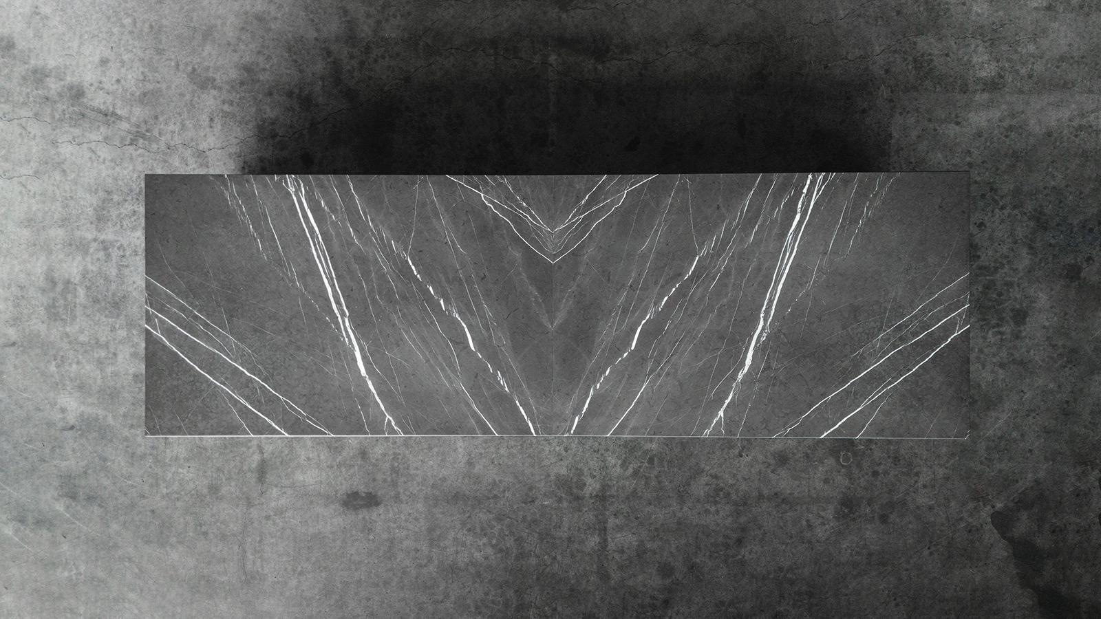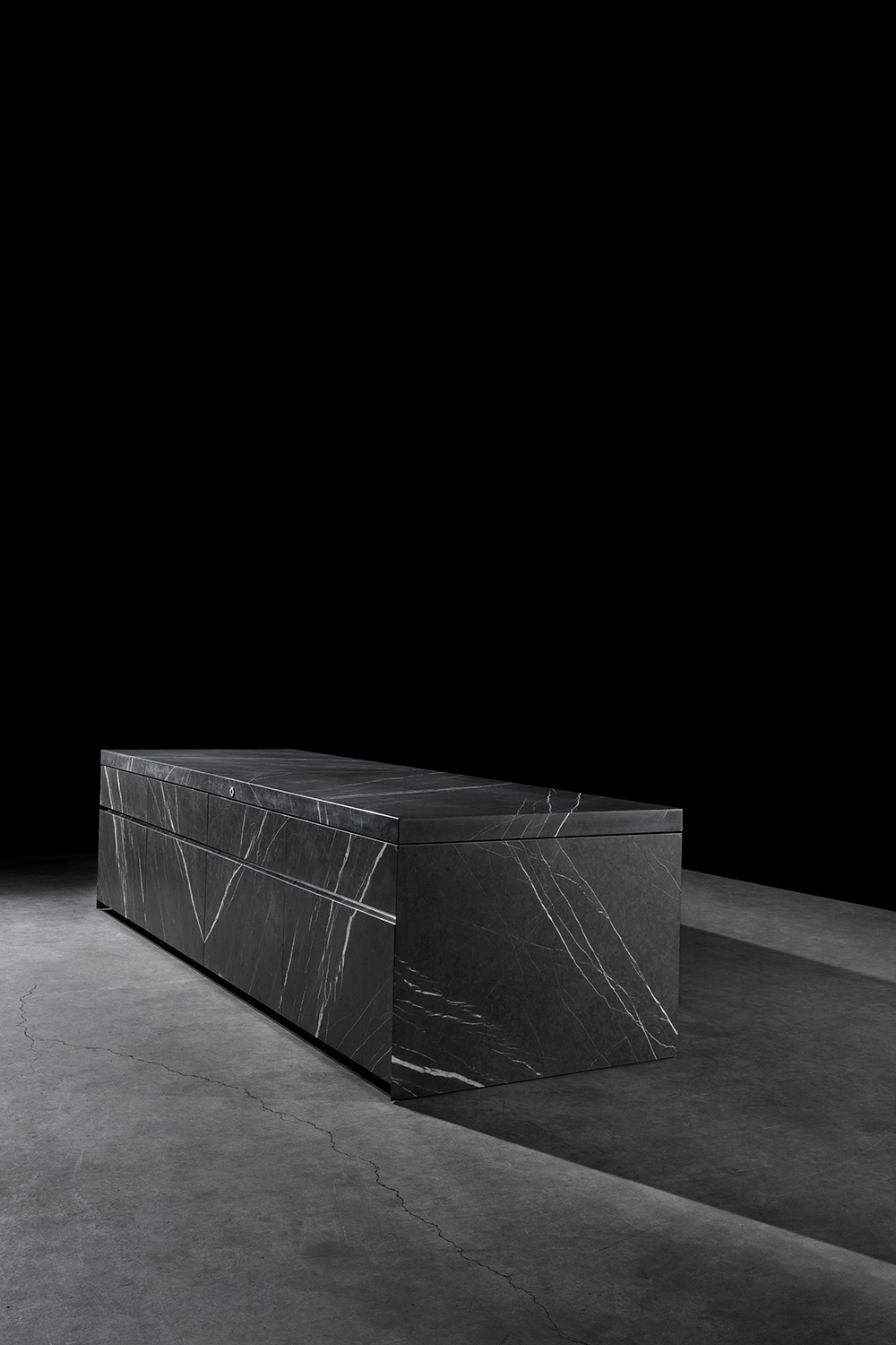 NP4 is characterized by a combination of unique elements that define its contemporary spirit. In this version, the 13-foot (4000 mm) island is made of gray stone rather than Super White marble, offering a more textured and sophisticated look. Retractable doors in thermo-treated oak elegantly conceal the equipment, while the new motorized backsplash reveals a backlit onyx panel with an integrated aluminum storage accessory. The island features the largest sliding marble top ever made, which moves via a safe mechanical control system and locks securely in both open and closed positions. Beneath the precious marble lies a stainless steel worktop with an integrated sink, allowing users to cook freely without the risk of staining the natural stone.